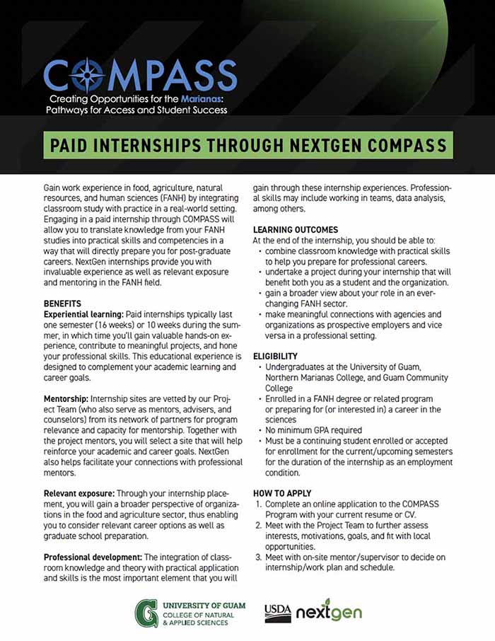 Engaging in a paid internship through COMPASS will allow you to translate knowledge from your food, agriculture, natural resources, or human sciences (FANH) studies into practical skills and competencies in a way that will directly prepare you for post-graduate careers. NextGen internships provide you with invaluable experience as well as relevant exposure and mentoring in the FANH field.